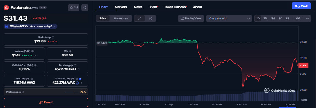 It is trading at $31.43 after losing over 4% of its value in the past 24 hours.