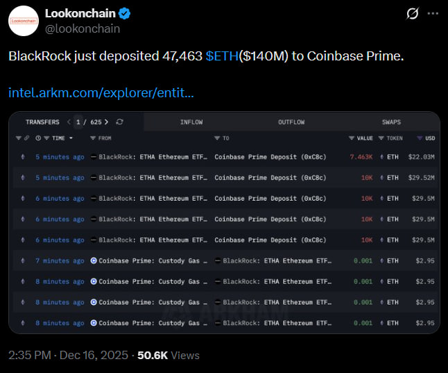 According to Lookonchain, BlackRock has deposited 47,463 ETH, valued at approximately $140 million, to Coinbase Prime.