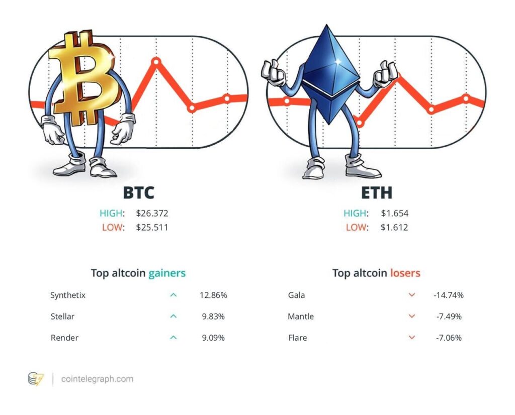 At the end of the week, Bitcoin (BTC) is at $25,871, Ether (ETH) at $1,635 and XRP at $0.50. The total market cap is at $1.04 trillion, according to CoinMarketCap.