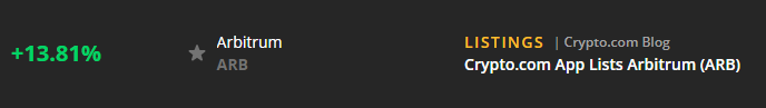 Arbitrum jumped 14% on news of its listing on the Crypto.com platform.