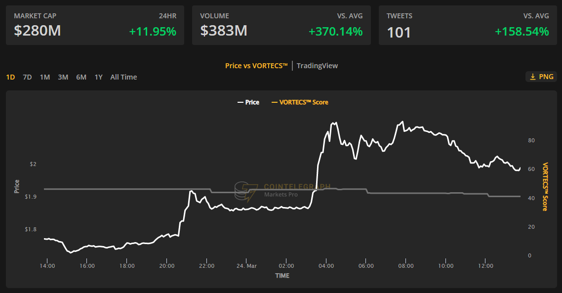 Price chart of OmiseGo’s surge in Tweet volume March 24. Source: Cointelegraph Markets Pro