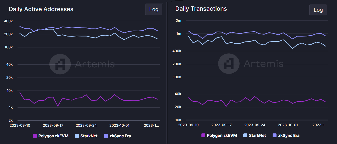Metrics from Artemis, an on-chain data provider, reveal a significant disparity between Polygon zkEVM’s 6,210 active addresses compared to StarkNet’s 154,390 and zkSync ERA’s 239,810. A similar discrepancy exists when analyzing the number of daily transactions, with Polygon’s ZK-rollup also trailing competitors.