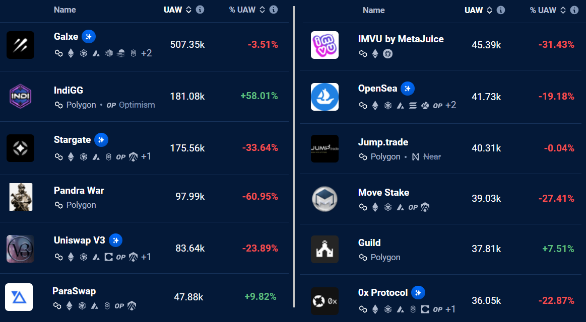 On average, the top 12 DApps on the Polygon network experienced a 17% decline in the number of active addresses over the last 30 days. This issue was particularly concerning in the NFT and decentralized finance markets, notably affecting applications like Uniswap, OpenSea and Move Stake.