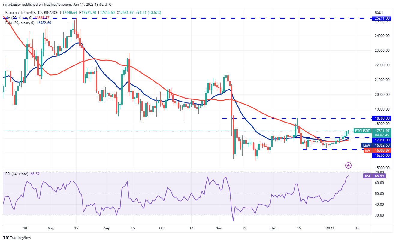 The 20-day exponential moving average ($16,982) has turned up and the relative strength index (RSI) is above 66, indicating that bulls are in control. The BTC/USDT pair could climb to $17,850 and if this level is scaled, the next stop may be $18,388.