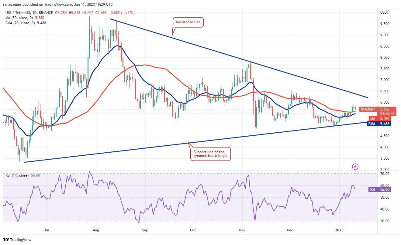 After trading between the moving averages for a few days, Uniswap (UNI) broke and closed above the 50-day SMA ($5.58) on Jan. 8. This indicates that the uncertainty resolved in favor of the bulls.