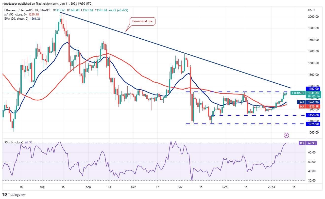 Ether (ETH) has been trading near the overhead resistance of $1,352 for the past two days. The 20-day EMA ($1,261) has started to turn up and the RSI is near the overbought territory, indicating the path of least resistance is to the upside.