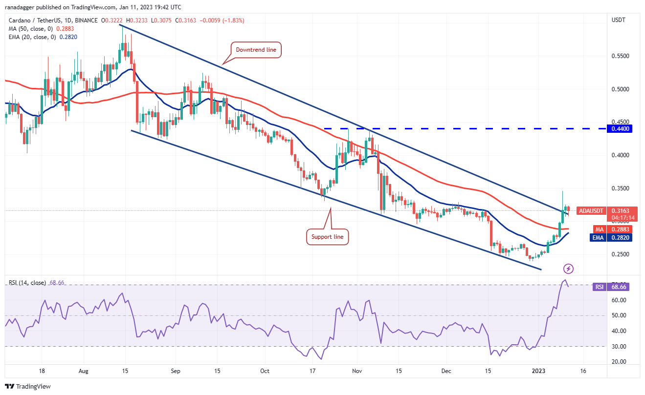 The bears are trying to yank the price back into the wedge on Jan. 11. If they succeed, the ADA/USDT pair could slide to the moving averages.