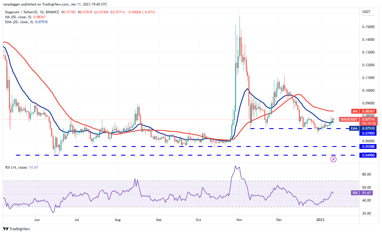 Buyers tried to thrust Dogecoin (DOGE) above the overhead resistance at $0.08 on Jan. 9 but the long wick on the candlestick shows that bears are fiercely guarding the level.