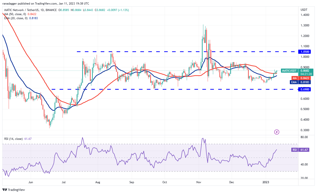 Polygon (MATIC) has been trading above the 50-day SMA ($0.84) since Jan. 9, which is a positive sign. This suggests that the bulls are trying to flip the moving averages into support.