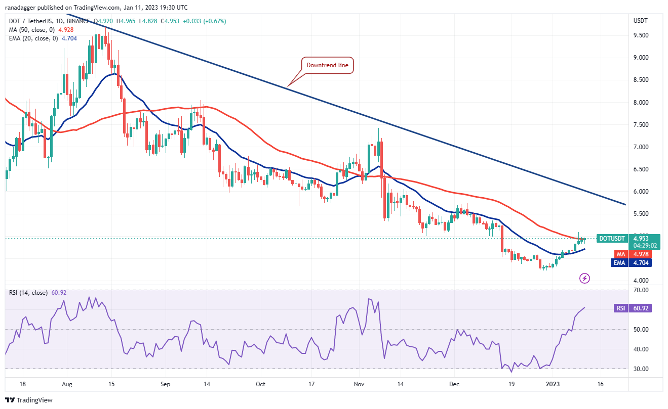 Polkadot (DOT) rose above the 50-day SMA ($4.92) on Jan. 9 but the higher levels attracted sellers as seen from the long wick on the day’s candlestick.
