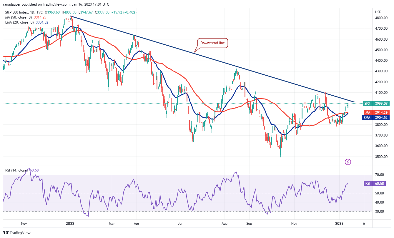 The S&P 500 continued its recovery last week and has reached the downtrend line. The 20-day exponential moving average (3,904) has started to turn up and the relative strength index (RSI) is in the positive territory, indicating advantage to the buyers.