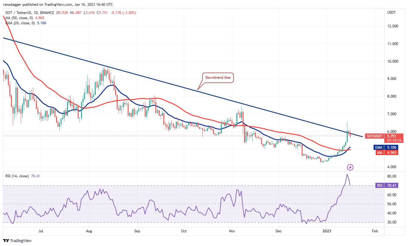 The DOT/USDT pair formed an inside-day candlestick pattern on Jan. 15, which resolved to the downside on Jan. 16. This suggests that the failure to sustain above the downtrend line may have tempted short-term traders to book profits.