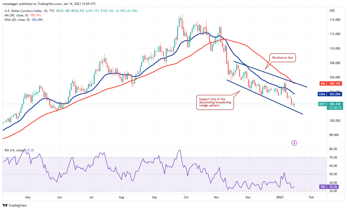 Contrarily, if buyers propel the price above the 20-day EMA, the index could march toward the resistance line of the wedge. The 50-day SMA (105) is placed close to the resistance line, hence the bears are likely to mount a strong defense at this level.