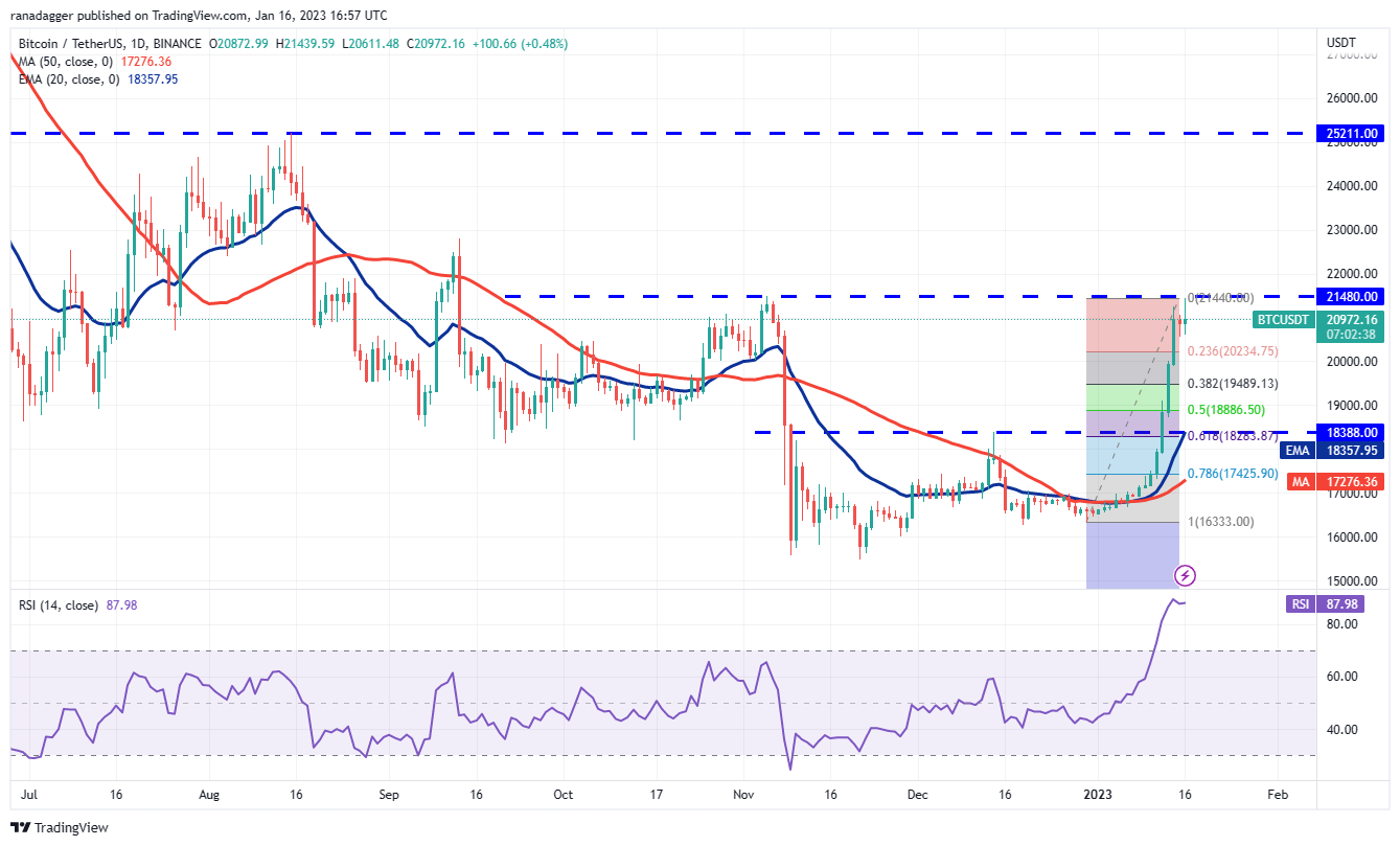 Buyers are trying to pierce the overhead resistance at $21,480 and extend the recovery in Bitcoin but the bears are in no mood to relent. The RSI remains in deeply overbought territory, indicating a possible consolidation or correction in the near term.