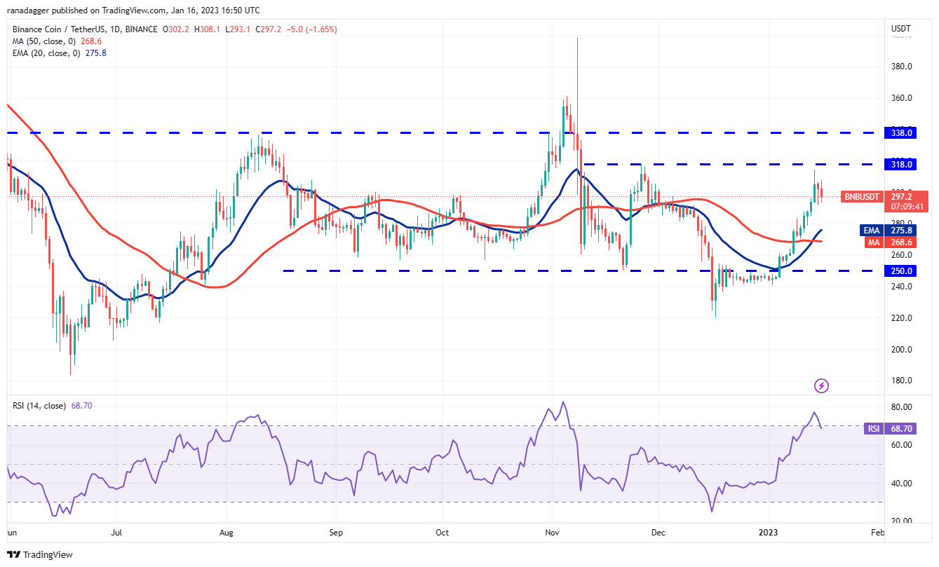 BNB (BNB) reached the overhead resistance at $318 on Jan. 14. The long wick on the day’s candlestick shows that the bears are trying to protect the level.