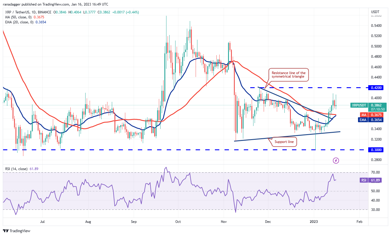 XRP (XRP) soared above the triangle and the moving averages on Jan. 11 but the bulls have failed to start a strong up-move. This shows a lack of demand at higher levels.
