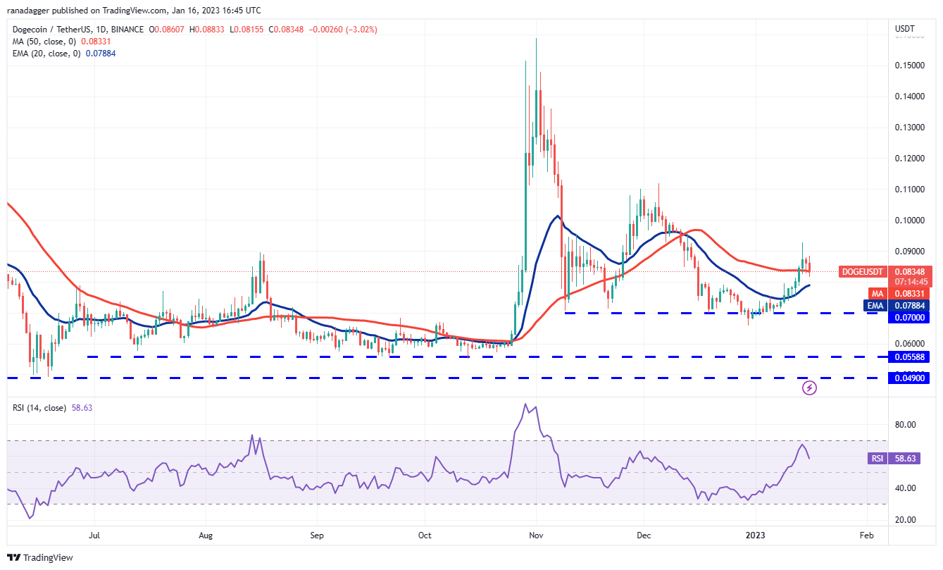 Dogecoin (DOGE) jumped above the 50-day SMA ($0.08) on Jan. 13 but the bulls could not capitalize on this strength. The long wick on the Jan. 14 candlestick shows that bears are selling above $0.09.