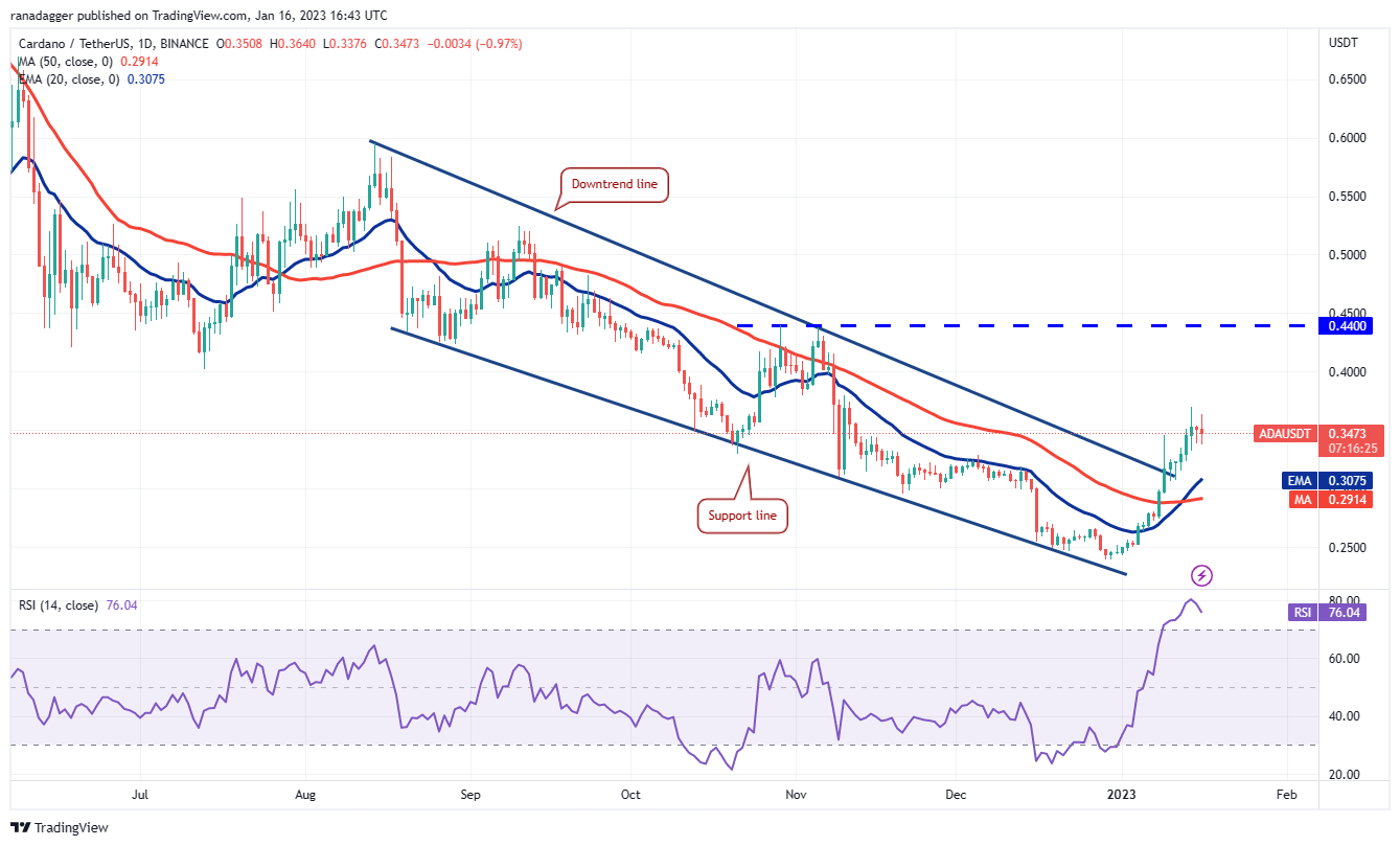 The ADA/USDT pair could turn down and slump to the 20-day EMA ($0.30). If buyers want to continue the recovery, they will have to defend this level aggressively. If the price bounces off the 20-day EMA with strength, it will increase the likelihood of a break above $0.37. The pair could then continue its northward march toward $0.44.