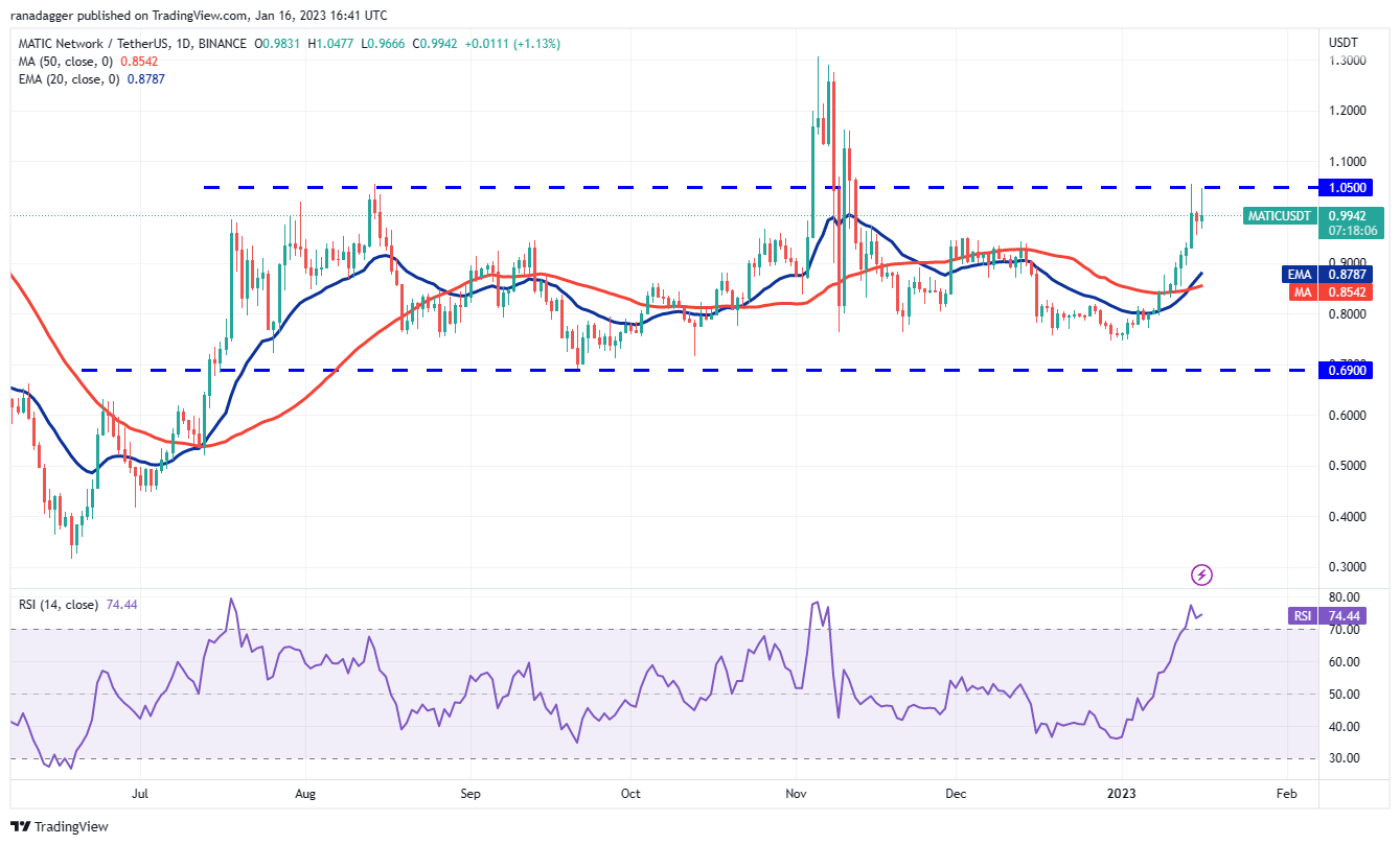Polygon (MATIC) touched the $1.05 overhead resistance level on Jan. 14 but the long wick on the candlestick indicates that the short-term traders may have booked profits.