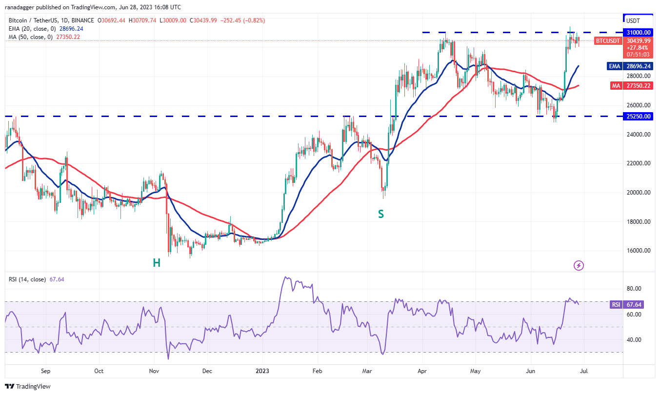 The bears are likely to make an attempt to sink the price below $29,500, but if bulls protect this level, it will indicate strength. The rising 20-day exponential moving average (EMA) of $28,696 and the relative strength index (RSI) in positive territory indicate that the path of least resistance is to the upside.