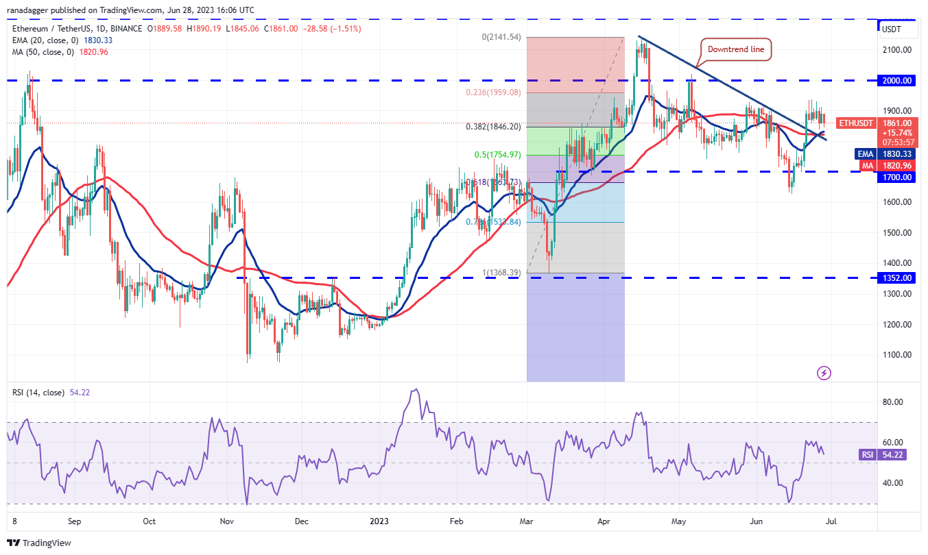 Ether’s (ETH) narrow range trading between $1,936 and $1,861 resolved to the downside on June 26. The bulls pushed the price back into the range on June 27 but could not sustain the higher levels.