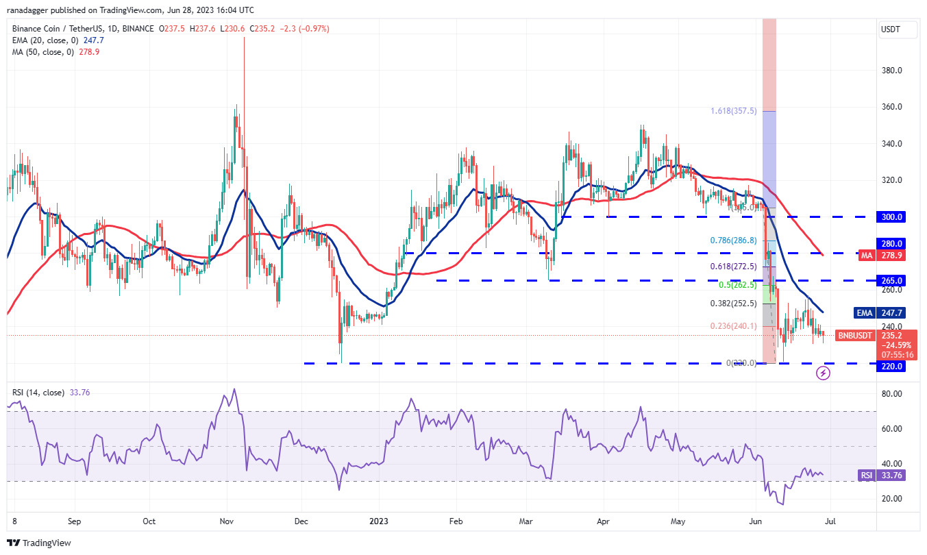 The first sign of strength will be a rise above the 20-day EMA ($247). That will indicate solid buying at lower levels. The BNB/USDT pair may then rise to the overhead resistance zone between $257 and $265.