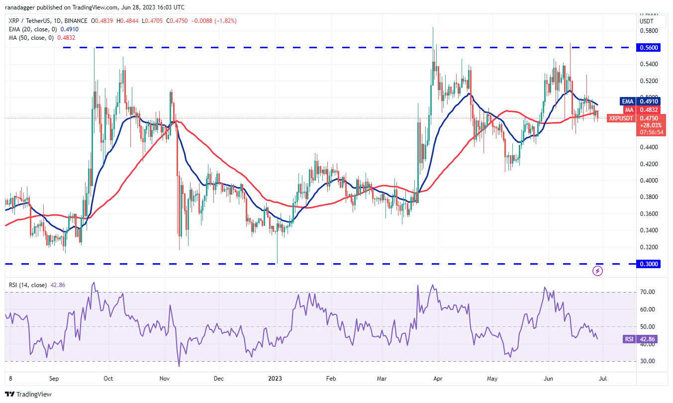 XRP (XRP) closed below the 50-day simple moving average (SMA) of $0.48 on June 26, and the attempts by the bulls to push the price back above the level failed on June 27. This suggests that the bears are trying to flip the 50-day SMA into resistance.
