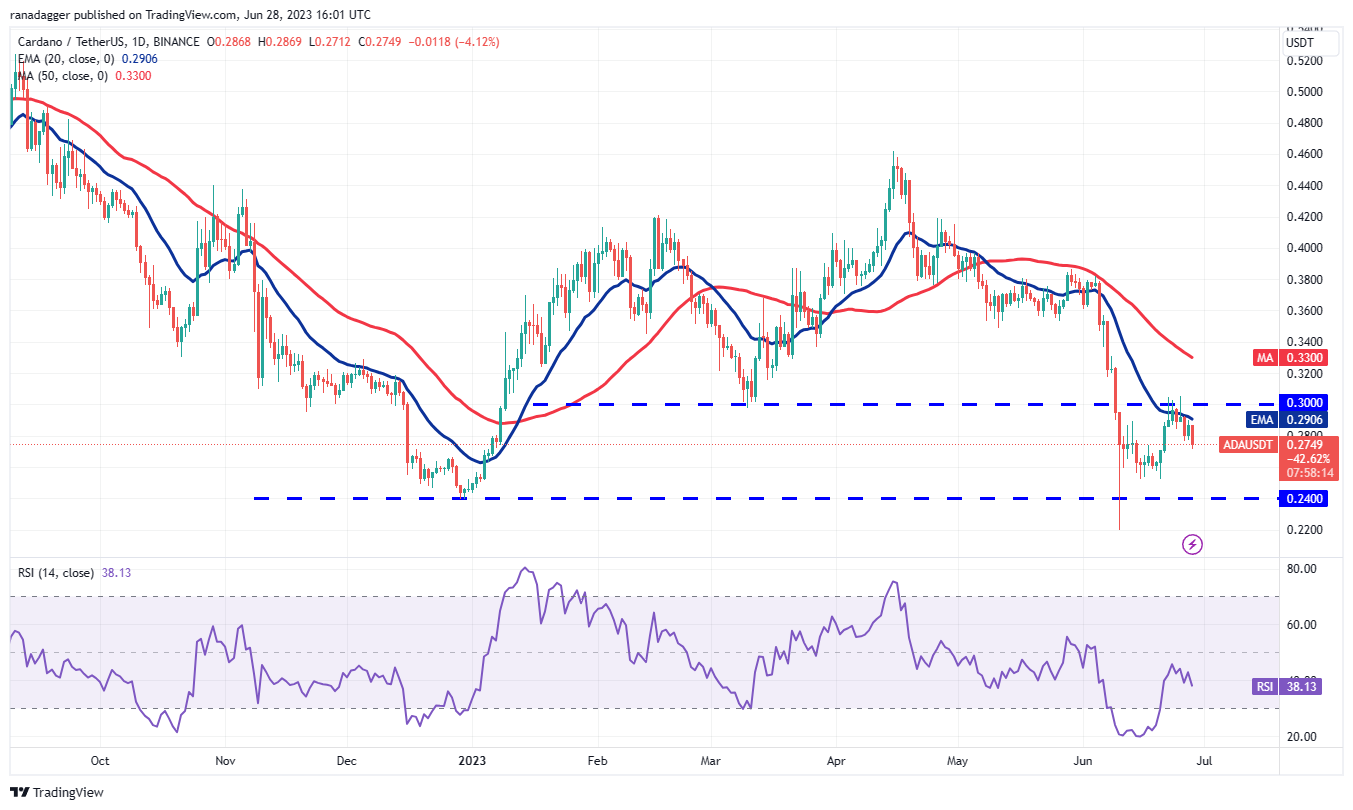The ADA/USDT pair turned down from the 20-day EMA ($0.29) on June 26, increasing the likelihood of range-bound action between $0.24 and $0.30 for a few days. Trading inside a range could be random and volatile.