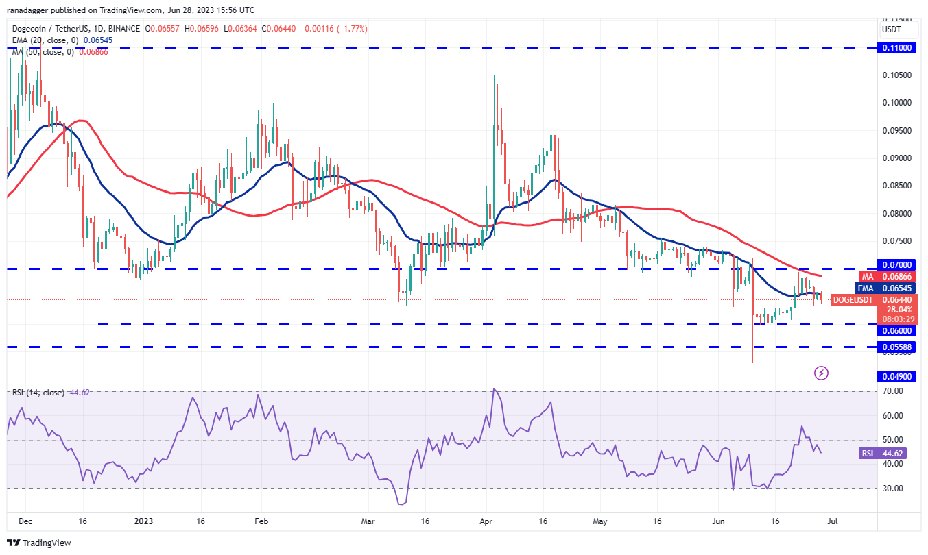 Dogecoin (DOGE) tripped below the 20-day EMA ($0.07) on June 26, indicating that the bears are fiercely defending the overhead resistance of $0.07.