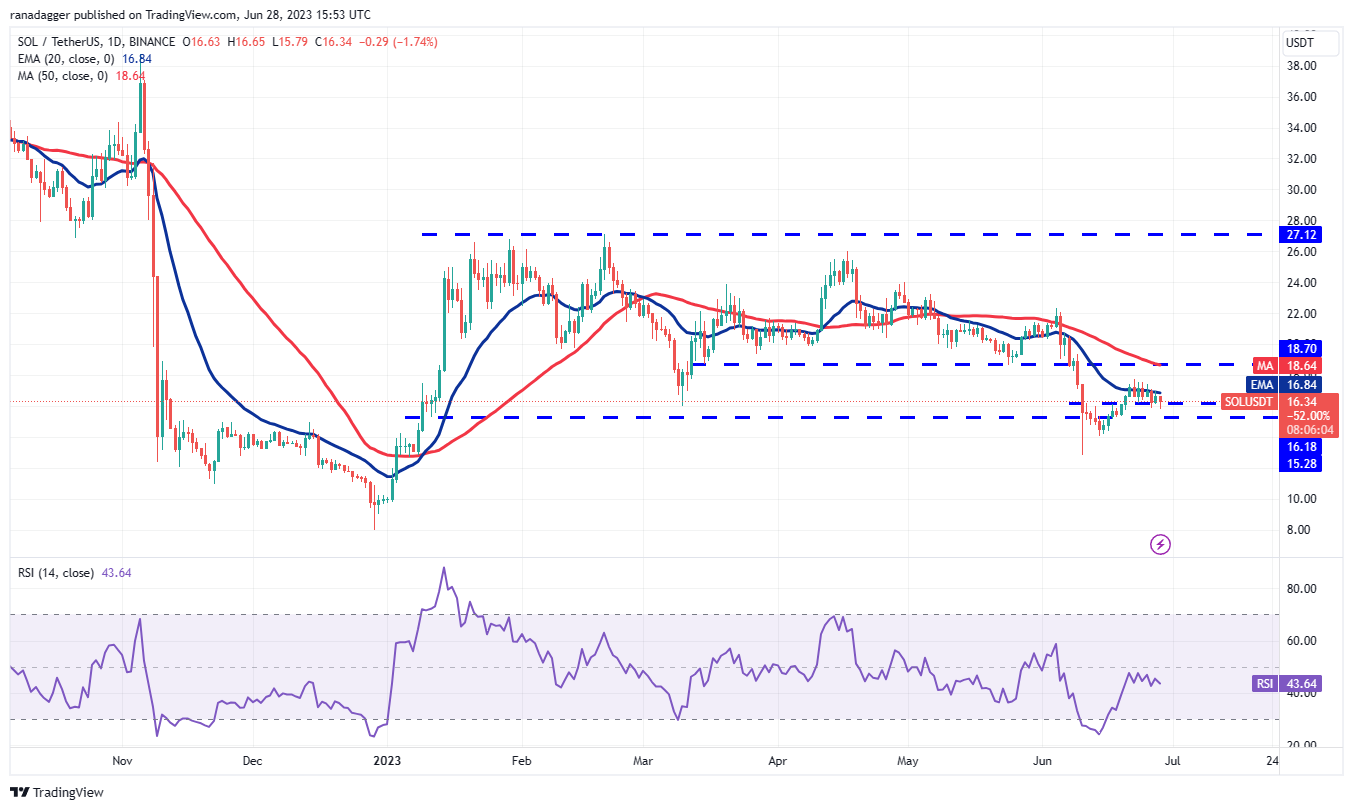 Solana (SOL) turned down from the 20-day EMA ($16.84) on June 26 and fell to the immediate support at $16.18. The bulls guarded the level on June 27, but they could not thrust the price above the 20-day EMA.