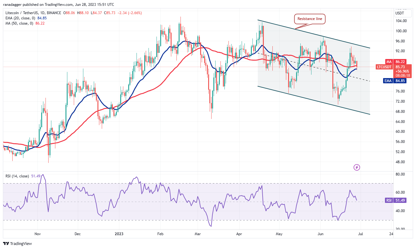 If the price dips below the moving averages, the LTC/USDT pair could drop to $80 and then to $76. That may keep the pair stuck inside the descending channel pattern for a while longer.