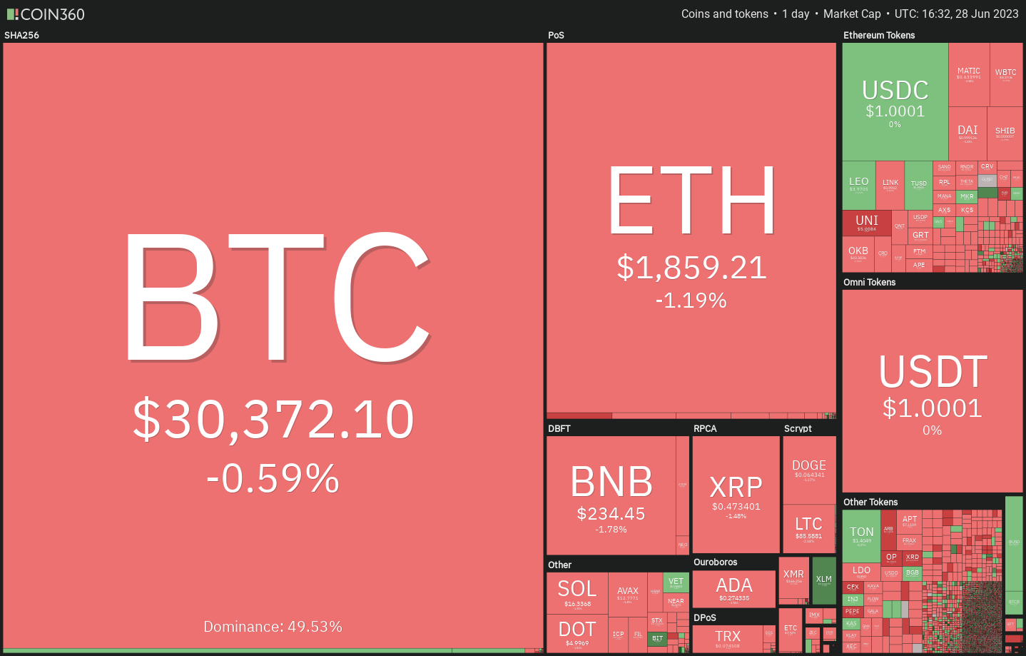Price analysis 6/28: BTC, ETH, BNB, XRP, ADA, DOGE, SOL, LTC, MATIC, DOT