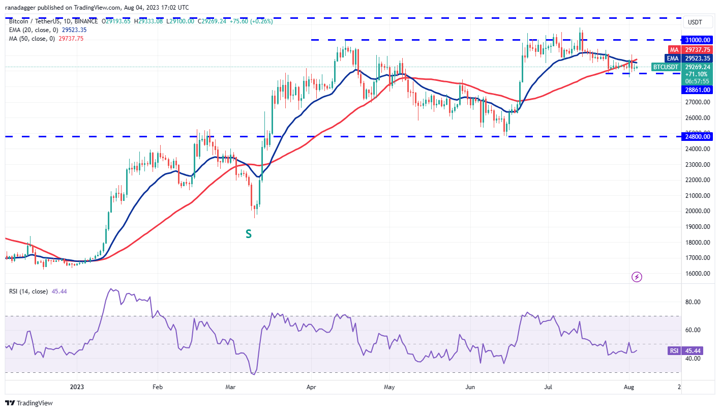 Bitcoin’s price is getting squeezed between the 20-day exponential moving average (EMA) of $29,523 and the horizontal support at $28,861.