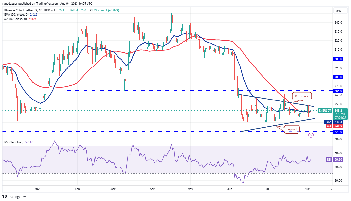 Both moving averages have flattened out and the RSI is near the midpoint, indicating a balance between supply and demand. This equilibrium will tilt in favor of the bulls if the price catapults above the triangle. The BNB/USDT pair could then attempt a rally to $265, where the bears may again pose a strong challenge.