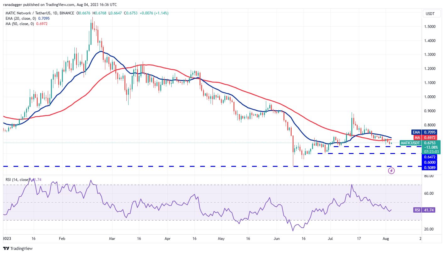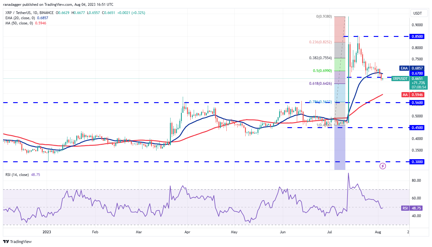 XRP (XRP) tumbled below the 20-day EMA ($0.68) on Aug. 2 and followed that up with another slide on Aug. 3. That sent the price tumbling below the strong support at $0.67.
