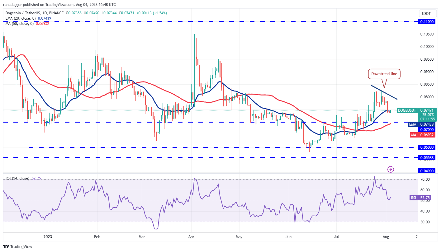 The bulls are trying to push the price back above the 20-day EMA on Aug. 4. If they succeed, the DOGE/USDT pair could rise to the downtrend line. This level is likely to attract selling by the bears.