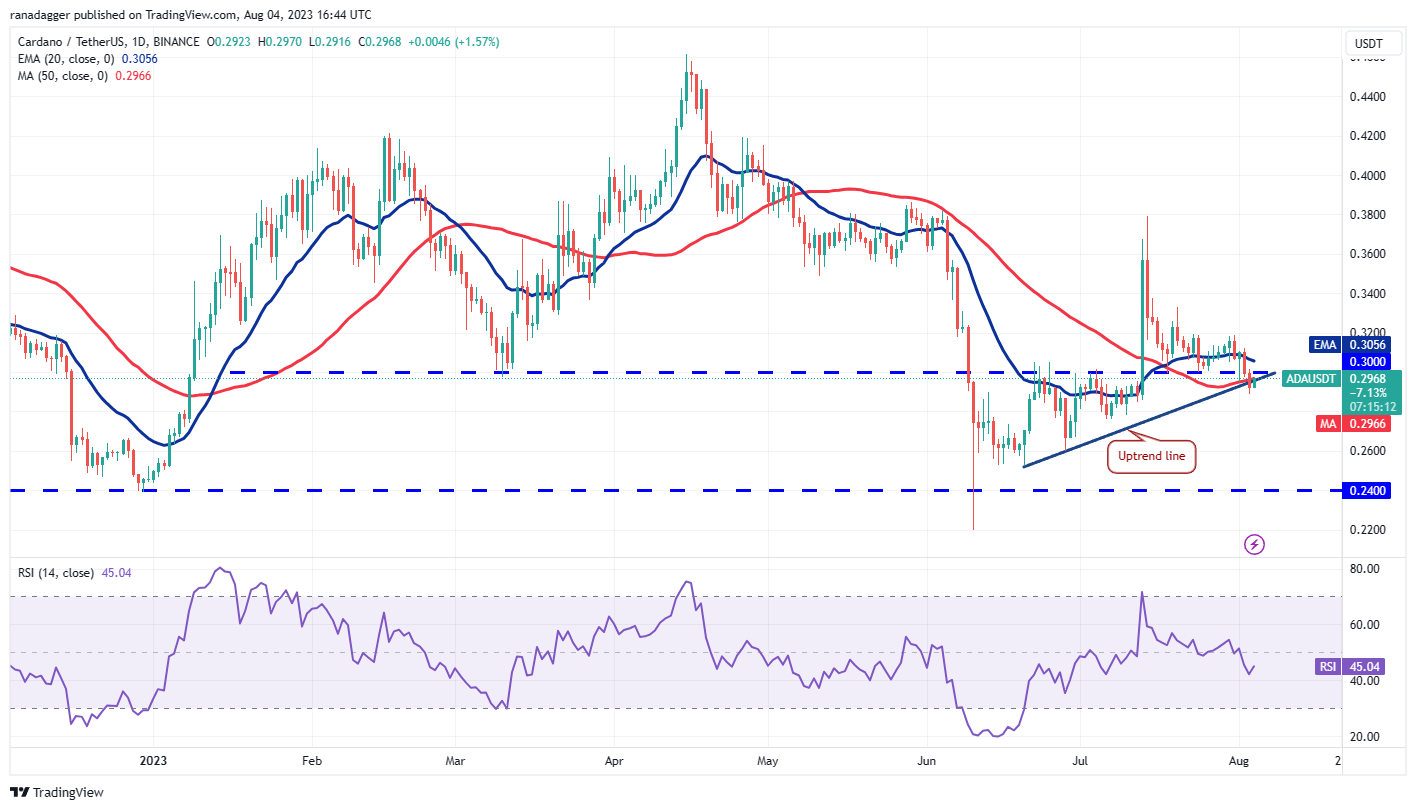 Cardano (ADA) broke below the 20-day EMA ($0.30) on Aug. 2 and the 50-day SMA ($0.30) on Aug. 3. This suggests that the bears are trying to seize control.