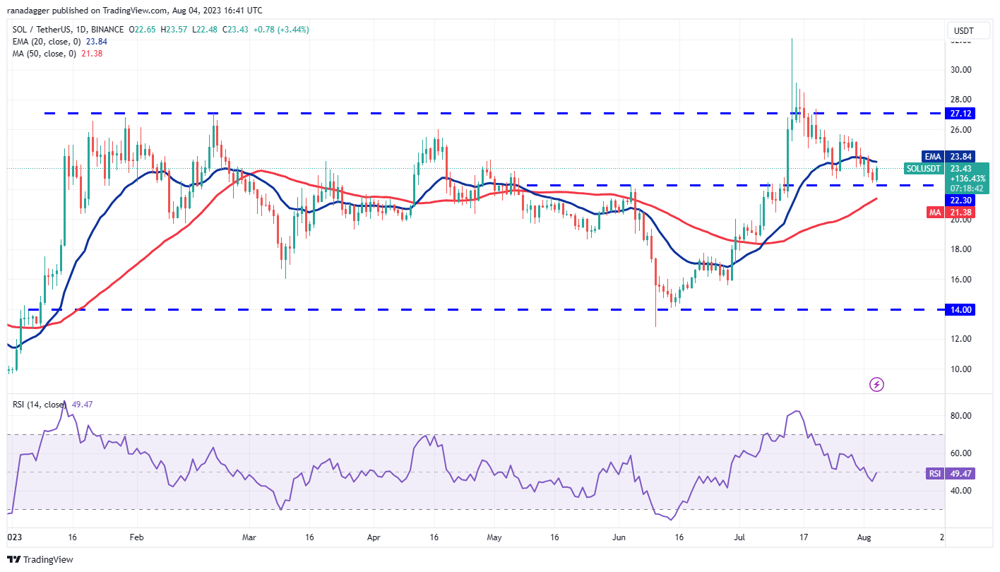 Solana (SOL) rebounded off the strong support at $22.30 on Aug. 4, indicating that the bulls continue to protect this level with vigor.
