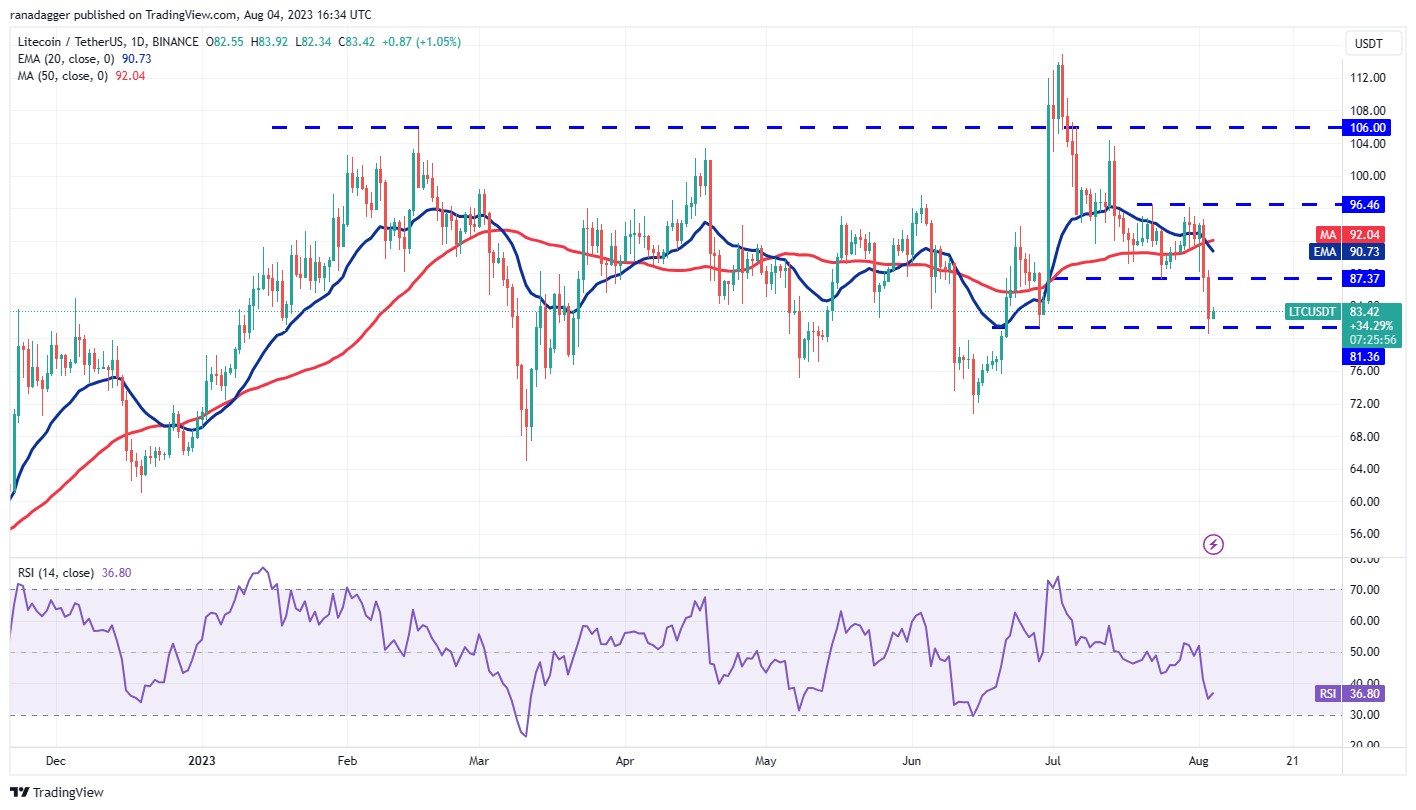 The bulls are trying to protect the support at $81.36, but the bears are unlikely to give up their advantage easily. If the price breaks below $81.36, the selling could intensify and the LTC/USDT pair may plummet to $76.