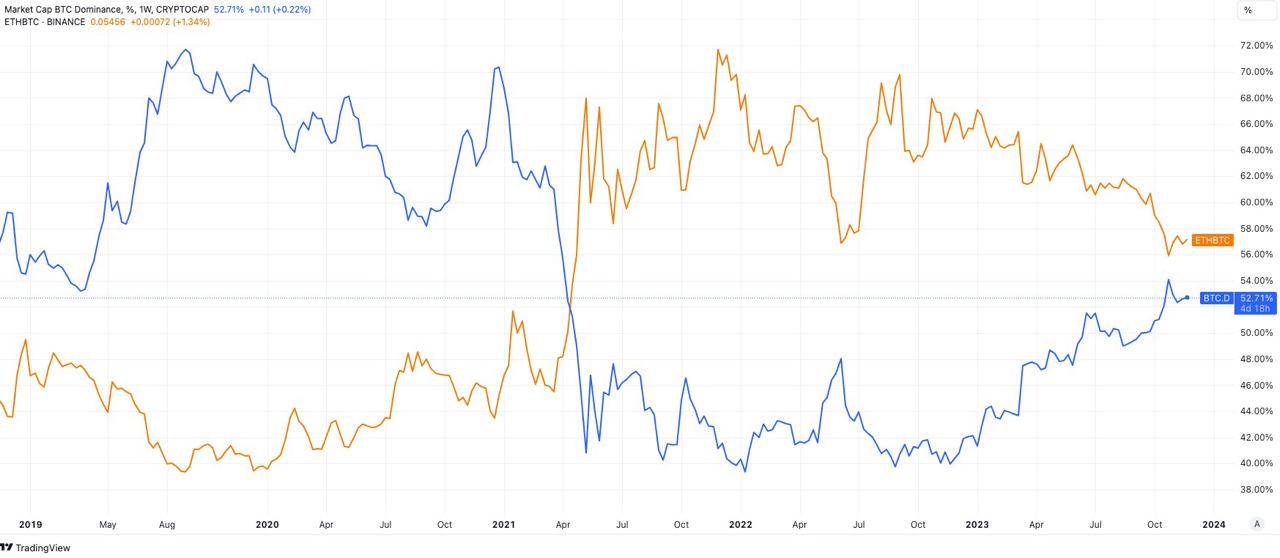 Throughout 2023, the narrative of Bitcoin’s dominance has fluctuated. While it appeared to regain dominance early in the year, this was more reflective of the ETH/BTC trading dynamics rather than an aggregate market movement.