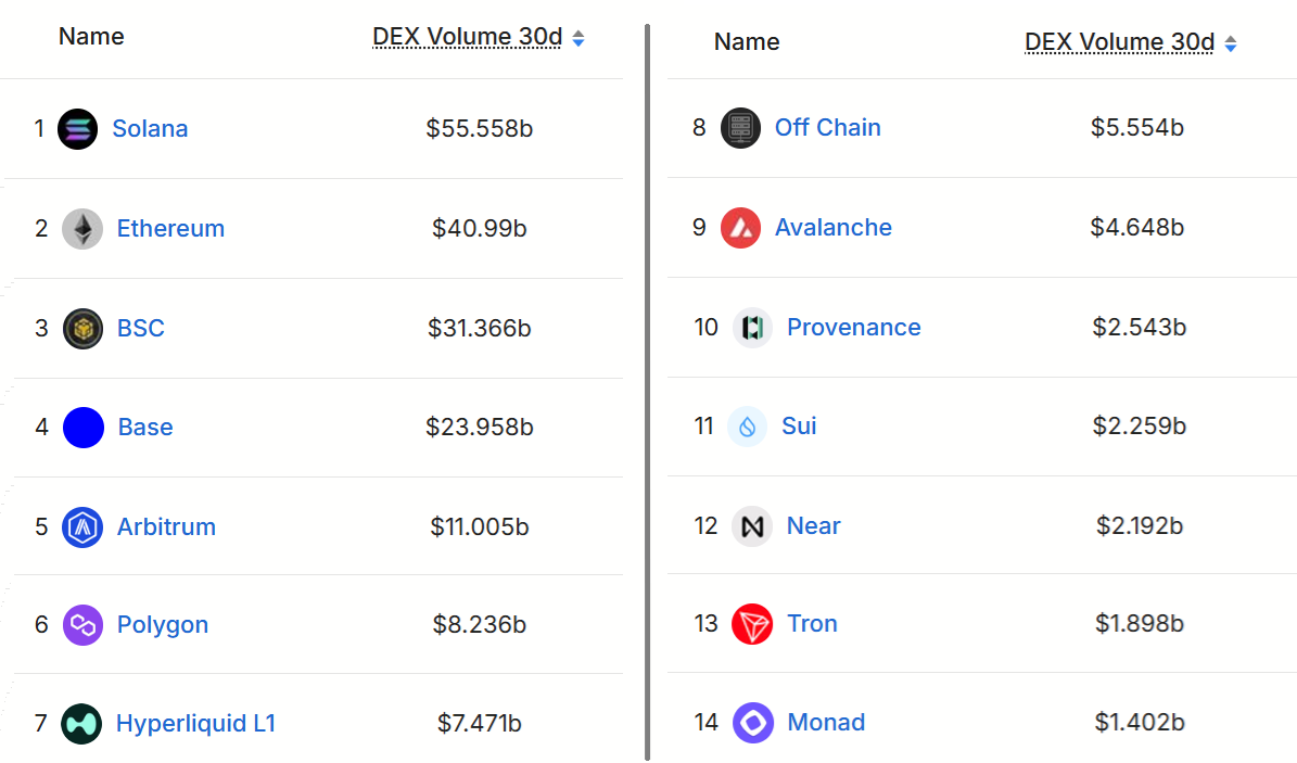 Network fees on Solana dropped to $18.5 million in March, a 42% decrease from January’s $30 million level. Most of this decline stems from lower activity in decentralized exchange (DEX) volumes. Despite maintaining leadership in absolute terms, Solana DEX volumes plummeted to $55.5 billion, their lowest levels since September 2024, according to DefiLlama data.