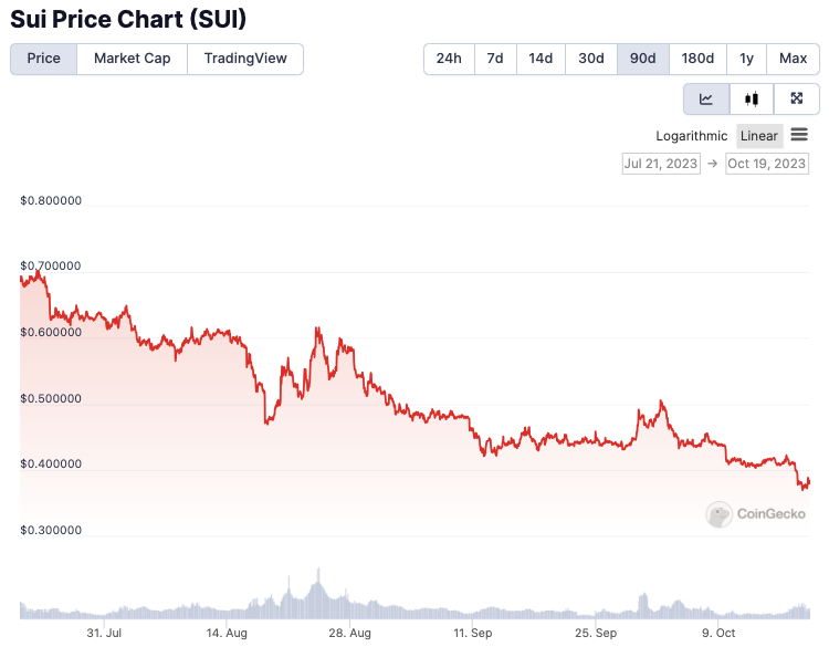 SUI token gained a little under 1% in the last 24 hours after falling from $0.41 on Oct. 16 to new lows of $0.37 on Oct. 18. Current prices mark a 7% decline in just two days, according to data from CoinGecko.
