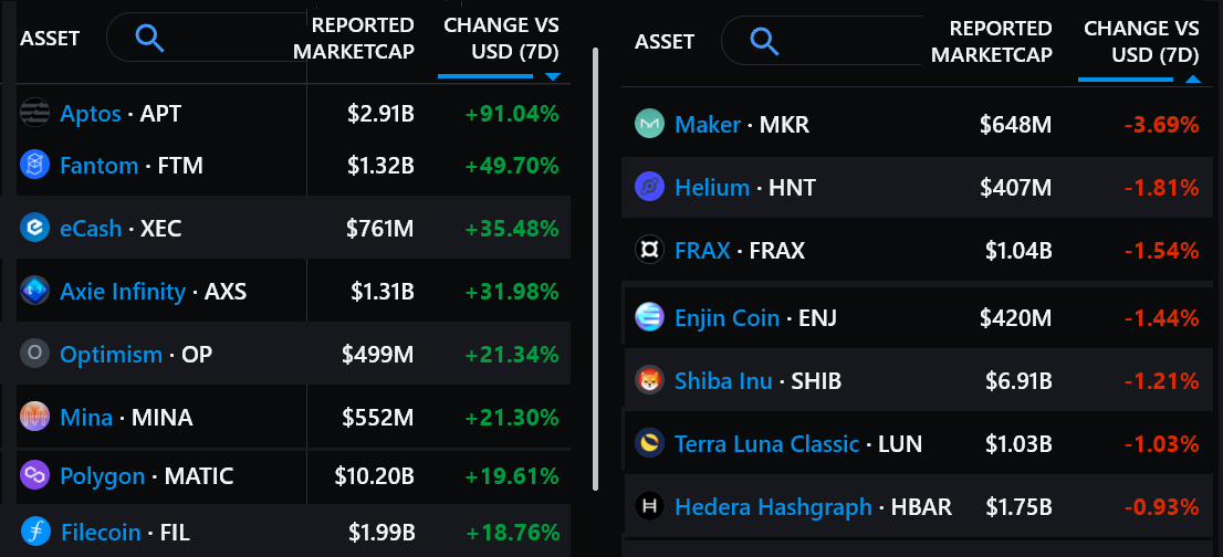 Aptos (APT) gained 91% after the smart contract network total value locked (TVL) reached a record-high $58 million, fueled by PancakeSwap DEX.