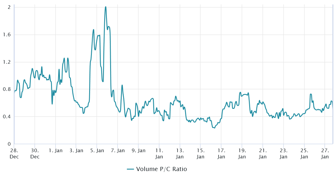 A 0.70 put-to-call ratio indicates that put options open interest lag the more bullish calls by 30% and is therefore bullish. In contrast, a 1.40 indicator favors put options by 40%, which can be deemed bearish.