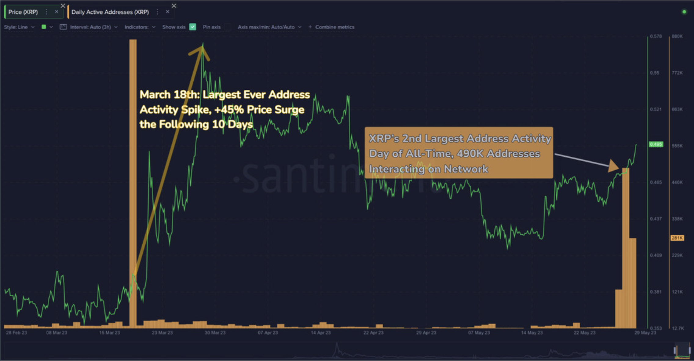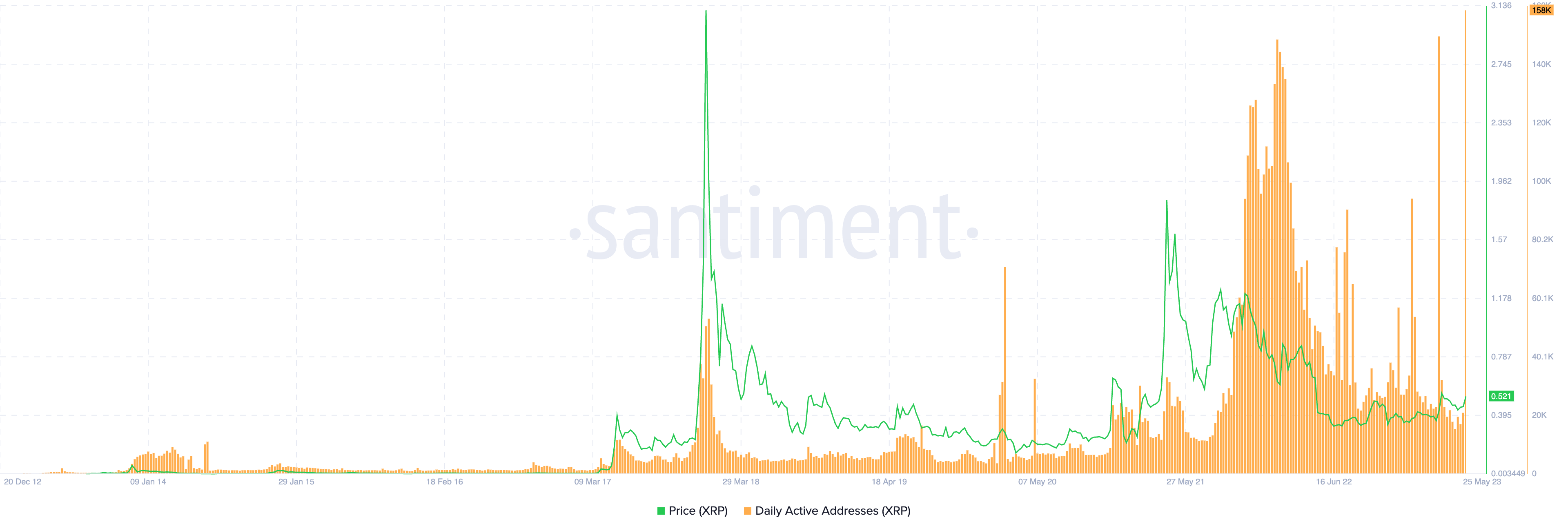 XRP DAA vs. daily price chart. Source: Santiment