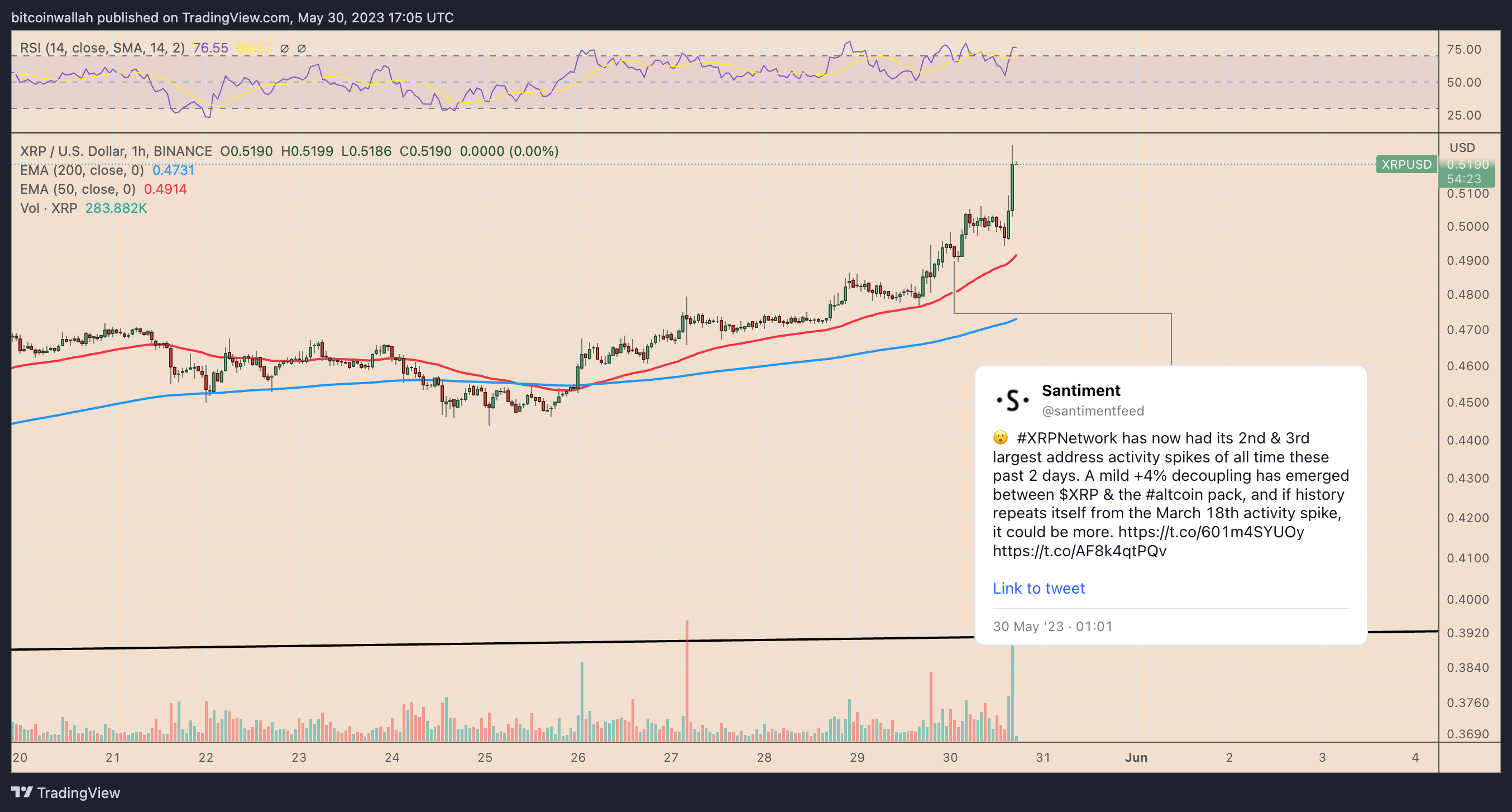 The price of XRP (XRP) rose 6% to $0.51 on May 30 as the market’s attention turned toward the latest spike in XRP network activity.